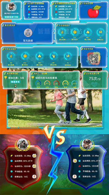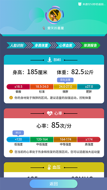 对步道或公园的游客进行体质数据收集,此产品用于公园、景区、校区锻炼场地、操场跑道等多处场景,可以快速检测出自身心率、身高、体重、血压、精神评估等实时报表数据,随时随地掌握当前运动健身状态,科学的心率分析监测、有效的人员导引策略、及时的学生体质健康的导引,做出必要调整,并以数据统计的图表显示在步道大屏上。